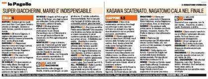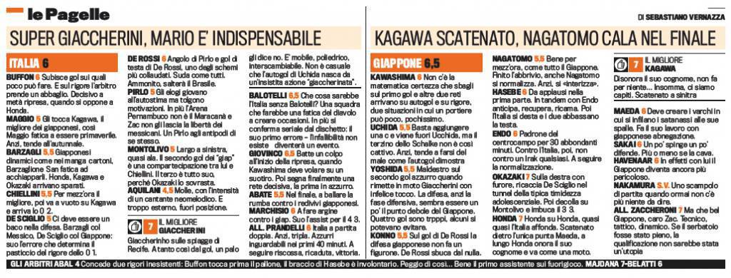ITALIA GIAPPONE VOTI PAGELLE GAZZETTA – Poco più in basso troverete i voti e le pagelle Gazzetta dello Sport di Italia-Giappone, gara conclusasi con il rocambolesco risultato di 4 a 3 per gli azzurri. Il man of the Match è Giaccherini (voto 7), che obbliga l’avversario all’autogol, colpisce un palo, ed è sempre presente. Molto bene anche Balotelli (voto 6.5), autore di un nuovo gol su rigore, il decimo con la maglia della nazionale. Deludono invece Aquilani e Pirlo, quest’ultimo, appannato dopo la grande prova d’esordio contro il Messico.