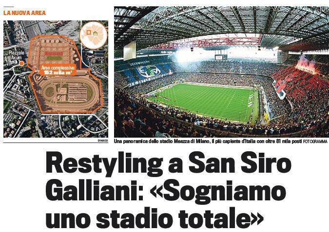 MILAN SAN SIRO – Inizieranno a breve le grandi manovre per la nascita del nuovo San Siro. Come sottolineato più volte dall'ad rossonero Galliani, il Milan punta a modernizzare il Meazza per elevarlo alla categoria Elite, che permetterebbe di ospitare allo stesso la finale Champions del 2016. L'idea del Milan è quello di fare un San Siro più piccolo, circa 60mila posti a sedere, ma nel contempo più moderno e sicuro, con attività commerciali che rendano lo stadio agibile per tutta la settimana e non solo in occasione della domenica. Il nuovo progetto dovrebbe nascere con la collaborazione dell'Inter, e riguarderà la ri-pianificazione di tutta l'area attuale dello stadio compresa quella del trotto. L'ostacolo principale sarà convince il Comune di Milano a cedere la struttura.