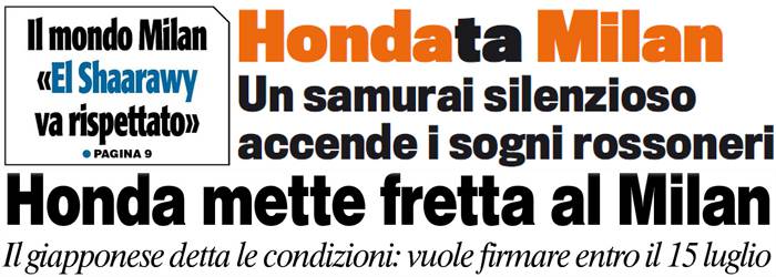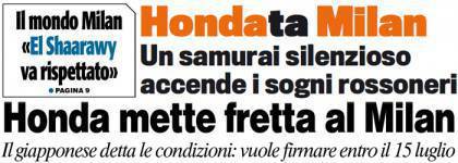 I titoli Gazzetta, CorSport e Tuttosport: “El Shaarawy va rispettato”, HondaTA Milan – Foto 30/06/2013 - 08:21 di Redazione2 RASSEGNA STAMPA MILAN FOTO – Di seguito potete trovare i principali titoli dei tre quotidiani sportivi, La Gazzetta dello Sport, Corriere dello Sport e Tuttosport, riguardanti naturalmente il nostro Milan. La redazione di Milanlive.it
