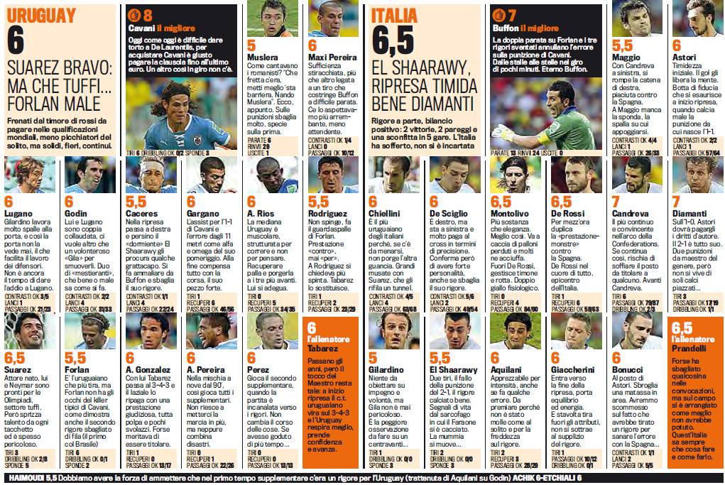 URUGUAY ITALIA VOTI PAGELLE GAZZETTA DELLO SPORT – Poco più in basso troverete i voti e le pagelle Gazzetta dello Sport relative alla sfida fra l’Uruguay e l’Italia, gara valevole per la finale del terzo/quarto posto della Confederations Cup e conclusasi con la vittoria degli azzurri dopo i calci di rigori. Migliore dell’Italia è Buffon, autore di grandi parate durante il match (nonostante la sbavatura sulla punizione di Cavani) e capace di respingere ben tre rigori. Segnali di vita da El Shaarawy, subentrato in corso d’opera, mentre bene Montolivo, protagonista di una prova più di sostanza che di qualità.