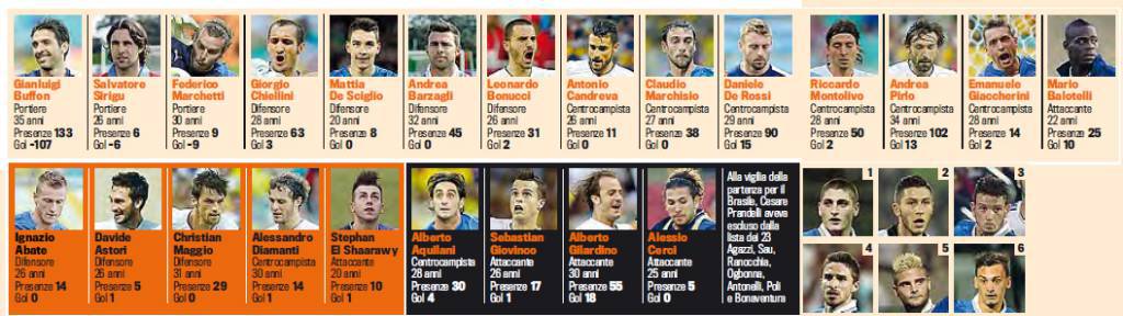 ITALIA MONDIALI 2014 – La Confederations Cup conclusasi pochi giorni fa è stato di fatto un importante e prestigioso test in vista dei Mondiali 2014. Ct Prandelli avrà tratto informazioni importanti dalle sfide in Brasile ed è possibile già ipotizzare, a grandi linee, da quali giocatori sarà composto il gruppo di nazionale che si giocheranno il titolo Mondiale fra meno di 12 mesi. Del gruppone che è tornato poco fa da Rio dovrebbero rimanere esclusi 4 giocatori e precisamente Aquilani, Giovinco, Gilardino e Cerci, tutti e 4 poco funzionali al gioco di Prandelli, e per il Gila si tratta in particolare anche di una questione di età. In dubbio invece la presenza di Abate, Astori, Maggio, Diamanti, ed El Shaarawy. Infine le new entry, che saranno sicuramente Verratti, Florenzi, Insigne e Marrone. A loro dovrebbero aggiungersi anche Borini e Gabbiadini.