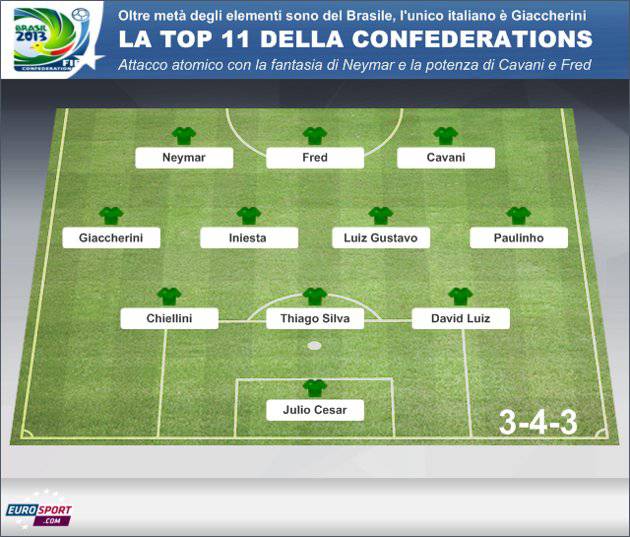 TOP 11 CONFEDERATIONS CUP – Il sito online di Eurosport ha stilato l’11 ideale della Confederations Cup, Torneo conclusosi domenica sera con la vittoria schiacciante del Brasile sulla Spagna. Un 11 composto essenzialmente da verdeoro anche se non mancano gli azzurri. Due gli unici italiani presenti e precisamente Giaccherini e Chiellini, entrambi della Juventus.