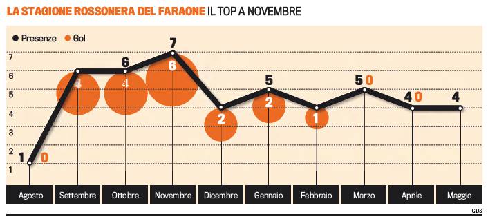 FOTO GOL FARAONE – La Gazzetta dello Sport ha pubblicato una grafica decisamente esplicativa che mostra nel dettaglio come si sono distribuite le reti di El Shaarawy durante la scorsa stagione. Salta subito all’occhio il fantastico mese di novembre, condito da 6 reti in 7 presenze. Male invece la primavera, con i mesi di marzo, aprile e maggio all’asciutto. Molto bene anche settembre e ottobre, con 6 presenze e 4 marcature per ogni mese.