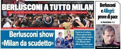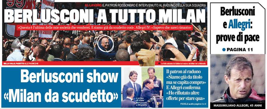 I titoli Gazzetta, CorSport e Tuttosport: Berlusconi show a Milanello, Allegri prove di pace – Foto 09/07/2013 - 07:31 di Redazione2 RASSEGNA STAMPA MILAN FOTO – Di seguito potete trovare i principali titoli dei tre quotidiani sportivi, La Gazzetta dello Sport, Corriere dello Sport e Tuttosport, riguardanti naturalmente il nostro Milan. La redazione di Milanlive.it