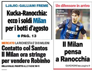 I titoli Gazzetta, CorSport e Tuttosport: il Milan pensa a Ranocchia, Robinho-Santos si stringe – Foto 10/07/2013 - 07:29 di Redazione2 RASSEGNA STAMPA MILAN FOTO – Di seguito potete trovare i principali titoli dei tre quotidiani sportivi, La Gazzetta dello Sport, Corriere dello Sport e Tuttosport, riguardanti naturalmente il nostro Milan. La redazione di Milanlive.it