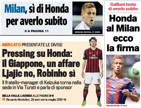 I titoli Gazzetta, CorSport e Tuttosport: Honda subito? Ljajic no, Robinho sì – Foto 12/07/2013 - 07:31 di Redazione2 RASSEGNA STAMPA MILAN FOTO – Di seguito potete trovare i principali titoli dei tre quotidiani sportivi, La Gazzetta dello Sport, Corriere dello Sport e Tuttosport, riguardanti naturalmente il nostro Milan. La redazione di Milanlive.it