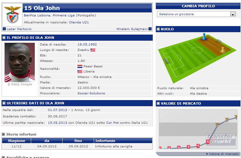 CALCIOMERCATO MILAN – C’è un nome nuovo sul taccuino dell’ad del Milan, Galliani. Si tratta precisamente di Ola John, esterno d’attacco sinistro/destro in forza a Benfica. Originario della Liberia ma con il passaporto dei Paese Bassi, Ola John è un classe 1992 dal fisico possente, con un valore però non proprio contenuto. Il cartellino del giocatore è infatti valutato attorno ai 10/12 milioni di euro, in virtù anche del contratto in scadenza al 30 giugno del 2017. Di seguito la scheda informativa di Transfermarkt.