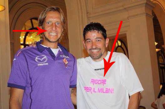 FOTO AMBROSINI FIORENTINA – Continua a far parlare di sì l’ex capitano del Milan, Ambrosini. Sia chiaro, il centrocampista della Fiorentina è ormai della Viola e può fare ciò che vuole, ma dopo 18 anni di rossonero i tifosi si aspettavano altro. Dopo le dichiarazioni durante la presentazione, in cui il senso era “La Viola meritava la Champions più del Milan”, il vecchio Ambro ne ha “combinata” un’altra. In rete è spuntata infatti una foto con un tifoso della Fiorentina con addosso la maglia “Rigore per il Milan”, lo sfottò della Viola nei confronti dei rossoneri, favoriti secondo gli stessi, dagli arbitri nella corsa alla Champions. Uno scatto che sicuramente farà discutere e che noi vi postiamo più in basso.