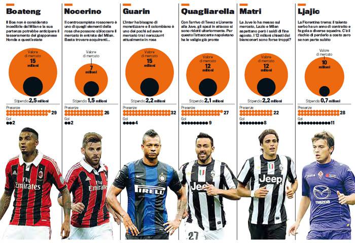 CALCIOMERCATO MILAN – La Gazzetta dello Sport ha realizzato un’interessante “inchiesta” sui calciatori della Serie A che potrebbero cambiare maglia da qui ai prossimi giorni. Una squadra composta da 11 giocatori di livello tra cui anche i due rossoneri Boateng e Nocerino. Entrambi sembrano vicini all’addio al Milan e stando a quanto riporta la Rosa in via Turati dovrebbero richiedere ben 22 milioni di euro. E’ questo infatti il valore assegnato dal quotidiano meneghino ai due rossoneri, suddiviso in 15 per il centrocampista ghanese, e in altri 7 per l’ex Palermo: concordate con questa valutazione o vi sembra fin troppo ottimistica?
