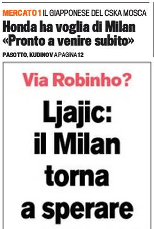 I titoli Gazzetta, CorSport e Tuttosport: Honda vuole il Milan subito, Robinho via, Ljajic si può – Foto 16/07/2013 - 07:30 di Redazione2 RASSEGNA STAMPA MILAN FOTO – Di seguito potete trovare i principali titoli dei tre quotidiani sportivi, La Gazzetta dello Sport, Corriere dello Sport e Tuttosport, riguardanti naturalmente il nostro Milan. La redazione di Milanlive.it