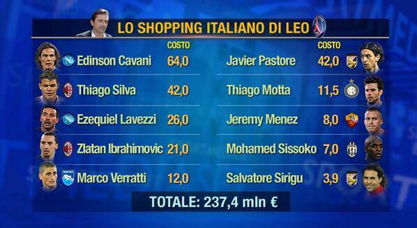 FOTO PAZZE SPESE PSG – Con l’ufficialità di ieri di Cavani al PSG, si completa un gruppone di 10 acquisti dei parigini in Serie A. Andando a spulciare nelle ultime operazioni del club transalpino si scopre come il club guidato da Laurent Blanc abbia speso quasi 240 milioni di euro (237,4 per l’esattezza), negli ultimi anni. L’investimento più oneroso è senza dubbio quello per Cavani, 64 milioni, ma spiccando anche i 42 per Thiago Silva, gli altrettanti 42 per Pastore, i 26 per Lavezzi, i 21 per Ibra e via discorrendo. Di seguito una bella grafica esplicativa realizzata dalla redazione di Mediaset Premium.
