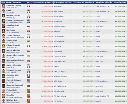 LE 20 PIU’ GRANDI PLUSVALENZA – Sul noto portale Transfermarkt, sito specializzato sul mercato, è possibile scrutare quali siano state le più grandi plusvalenze nella storia del mercato. Per chi non masticasse il gergo mercantile, la plusvalenza è il ricavato in più che una squadra ottiene rivendendo un giocatore rispetto al prezzo pagato per lo stesso. La Juventus comanda questa speciale classifica grazie all’operazione Zidane, pagato 3,5 milioni (trasformati dalle lire agli euro) dal Bordeaux e rivenduto a ben 73,5 milioni al Real. Il Milan segue a ruota con l’affare Kakà, pagato 8,250 milioni di euro dal San Paolo e girato sempre al Real a 65 milioni. Non mancano altri rossoneri in questo speciale elenco, come Shevchenko, Thiago Silva, e Kluivert.