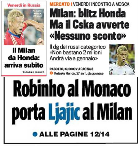 I titoli Gazzetta, CorSport e Tuttosport: blitz per Honda, Robinho al Monaco – Foto 17/07/2013 - 07:31 di Redazione2 RASSEGNA STAMPA MILAN FOTO – Di seguito potete trovare i principali titoli dei tre quotidiani sportivi, La Gazzetta dello Sport, Corriere dello Sport e Tuttosport, riguardanti naturalmente il nostro Milan. La redazione di Milanlive.it