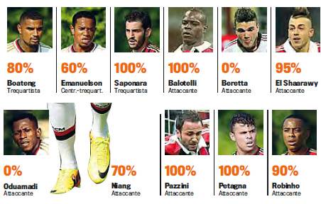 CALCIOMERCATO MILAN – Sono ben 11 i calciatori del Milan suddivisi fra la trequarti e l’attacco. Oltre ai noti Balotelli, El Shaarawy, Boateng, Robinho, Pazzini e Niang, a Milanello possono godere anche dei servigi di Saponara, Beretta, Emanuelson, Oduamadi e Petagna. 11 componenti come dicevamo, che secondo la Gazzetta dello Sport potrebbero rischiare il posto. Sono infatti solo tre quelli sicuri di restare, e precisamente Balotelli, Pazzini e il neo-arrivato Saponara. Gli altri 8, chi più/chi meno, rischiano il posto: di seguito le percentuali di permanenza.