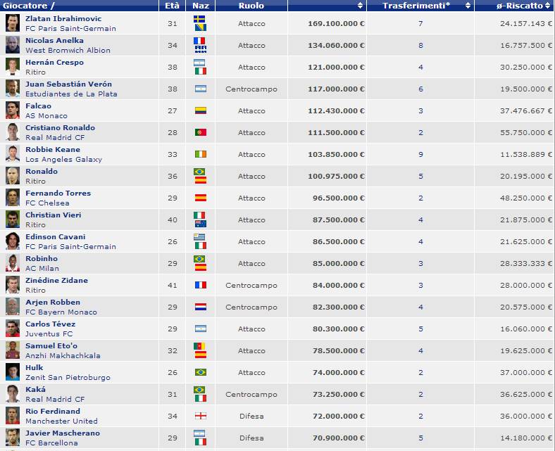 20 CALCIATORI PIU’ COSTOSI – Quali sono i calciatori che nella loro carriera hanno mosso più denari? Andando a ripercorrere tutta la storia relativa ai loro trasferimenti Transfermarkt.it ha stilato la classifica dei 20 calciatori costati di più nella storia, sommando i vari passaggi di squadra. Al primo posto, come non poteva essere altrimenti, troviamo Ibrahimovic, che in carriera è costato ben 169 milioni di euro ai vari PSG, Milan, Juve, Barcellona, Inter e via dicendo. Sorpresa al secondo posto per Anelka, che ha giocato in carriera in club blasonati come Real Madrid, Arsenal, PSG, City, Juventus ed altri ancora. Al terzo posto troviamo invece Crespo, seguito da Verona, Falcao e CR7. Fra le sorprese di questa top 20, Robbie Keane, Emerson e Huntelaar.