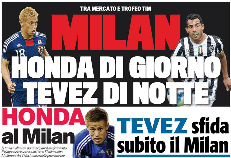I titoli Gazzetta, CorSport e Tuttosport: Honda al Milan, Tevez sfida i rossoneri – Foto 23/07/2013 - 07:28 di Redazione2 RASSEGNA STAMPA MILAN FOTO – Di seguito potete trovare i principali titoli dei tre quotidiani sportivi, La Gazzetta dello Sport, Corriere dello Sport e Tuttosport, riguardanti naturalmente il nostro Milan. La redazione di Milanlive.it