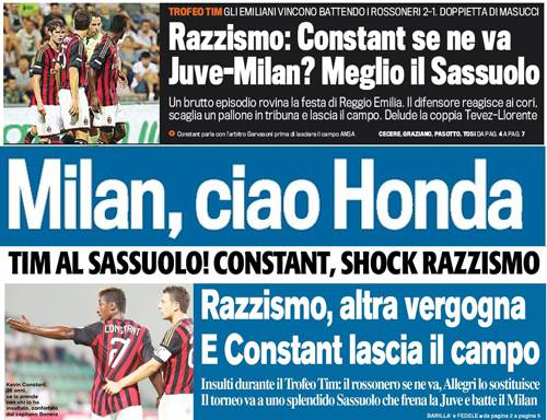 I titoli Gazzetta, CorSport e Tuttosport: Ciao Honda, cori razzisti per Constant, Tim al Sassuolo – Foto 24/07/2013 - 09:4524/07/2013 - 07:19 di Redazione2 RASSEGNA STAMPA MILAN FOTO – Di seguito potete trovare i principali titoli dei tre quotidiani sportivi, La Gazzetta dello Sport, Corriere dello Sport e Tuttosport, riguardanti naturalmente il nostro Milan. La redazione di Milanlive.it