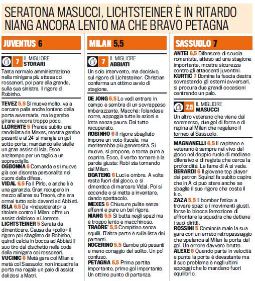 TROFEO TIM VOTI PAGELLE GAZZETTA DELLO SPORT – Di seguito potrete visionare i voti e le pagelle Gazzetta dello Sport del Trofeo Tim, classica amichevole estiva tenutasi ieri sera a Reggio Emilia al Mapei Stadium. Il triangolare, vinto dal Sassuolo, ha visto il Milan vittorioso contro la Juve ai rigori e poi sconfitto dai padroni di casa nella finalissima. Buona prova di Abbiati, il migliore in campo fra i rossoneri, ma anche di De Jong, eletto MVP dell’evento. Bene anche Robinho e il baby Petagna.