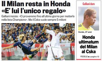 I titoli Gazzetta, CorSport e Tuttosport: ultimatum per Honda, è lui l’unico regalo – Foto 26/07/2013 - 07:07 di Redazione2 RASSEGNA STAMPA MILAN FOTO – Di seguito potete trovare i principali titoli dei tre quotidiani sportivi, La Gazzetta dello Sport, Corriere dello Sport e Tuttosport, riguardanti naturalmente il nostro Milan. La redazione di Milanlive.it