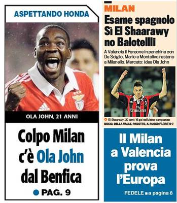 I titoli Gazzetta, CorSport e Tuttosport: El Shaarawy contro il Valencia, colpo Ola John – Foto 27/07/2013 - 07:16 di Redazione2 RASSEGNA STAMPA MILAN FOTO – Di seguito potete trovare i principali titoli dei tre quotidiani sportivi, La Gazzetta dello Sport, Corriere dello Sport e Tuttosport, riguardanti naturalmente il nostro Milan. La redazione di Milanlive.it