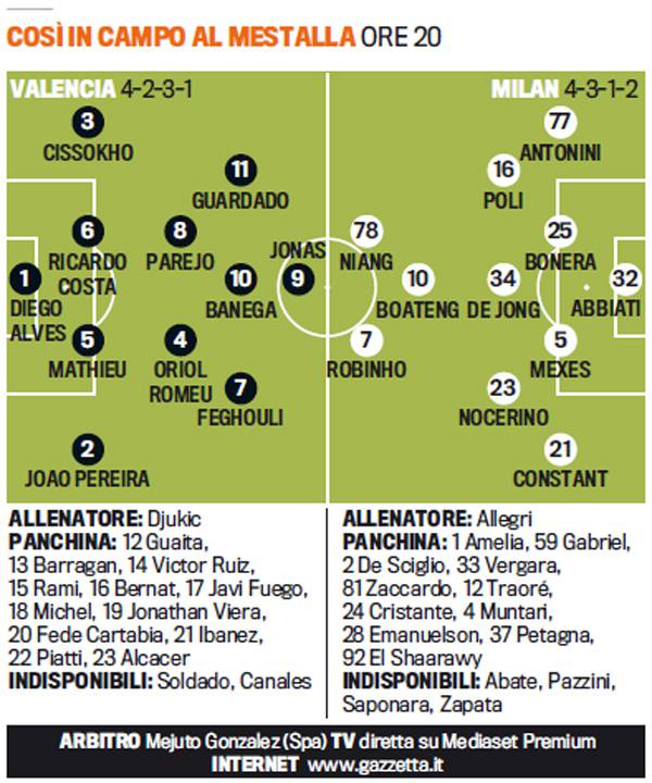 VALENCIA MILAN PROBABILI FORMAZIONI – Poco più in basso troverete le probabili formazioni di Valencia-Milan, amichevole estiva di lusso che si terrà questa sera alle ore 20 allo stadio Mestalla e che sarà valida per la Guinness Cup, prestigiosa coppa estiva. Allegri cercherà di rodare il suo nuovo 4-3-1-2 con un tridente d’attacco formato da Robinho e Niang supportati alle spalle da Boateng. El Shaarawy partirà dalla panchina mentre Balotelli e Montolivo danno forfeit perchè non al 100%. I nazionali, rientrati da poco a Milanello, giocheranno durante il secondo tempo mentre per i primi 45 minuti di gioco potrebbe vedere un 11 in parte rimaneggiato.