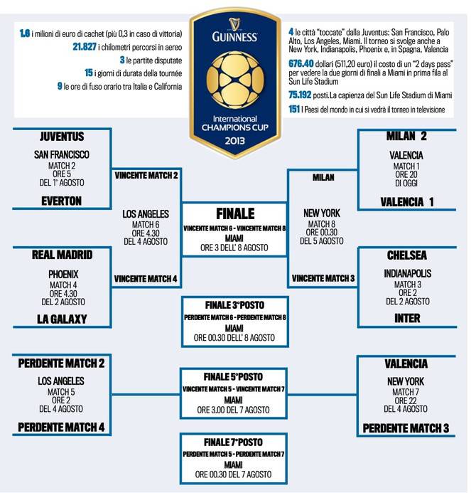 TABELLONE COMPLETO GUINNES CUP – Si è giocata ieri la prima sfida della Guinness Cup, spettacolare torneo estivo che ha l’obiettivo di ricreare una sorta di mini Champions fra Europa e Stati Uniti. Dopo la sfida di Valencia fra i padroni di casa e il Milan, conclusasi per 2 a 1 in favore dei rossoneri, il prossimo match si terrà nella giornata di giovedì uno agosto, in quel di San Francisco. Di scena la Juventus contro gli inglesi dell’Everton.