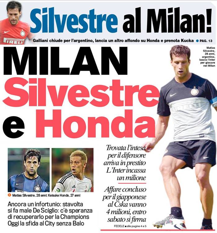 I titoli Gazzetta, CorSport e Tuttosport: Silvestre e Honda! Oggi la sfida al City, De Sciglio stop – Foto 31/07/2013 - 07:16 di Redazione2 RASSEGNA STAMPA MILAN FOTO – Di seguito potete trovare i principali titoli dei tre quotidiani sportivi, La Gazzetta dello Sport, Corriere dello Sport e Tuttosport, riguardanti naturalmente il nostro Milan. La redazione di Milanlive.it