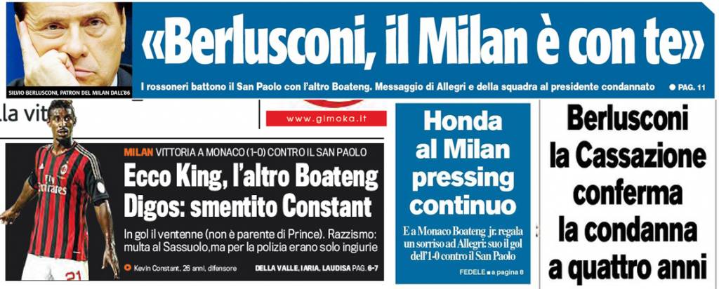 I titoli Gazzetta, CorSport e Tuttosport: Berlusconi, il Milan è conte! Gol dell’altro Boateng, pressing su Honda – Foto 02/08/2013 - 07:36 di Redazione2 RASSEGNA STAMPA MILAN FOTO – Di seguito potete trovare i principali titoli dei tre quotidiani sportivi, La Gazzetta dello Sport, Corriere dello Sport e Tuttosport, riguardanti naturalmente il nostro Milan. La redazione di Milanlive.it