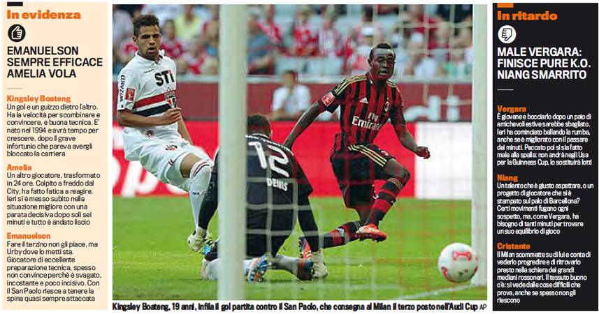 MILAN SAN PAOLO ANALISI GAZZETTA – La Gazzetta dello Sport ha analizzato stamane la partita fra il Milan e il San Paolo individuando i migliori del match e i peggiori. Promosso Kingsley Boateng, autore della rete dei rossoneri, nonché Emanuelson ed Amelia, quest’ultimo, molto reattivo contro i brasiliani. Fra i bocciati, Vergara, autore di un inizio shock per via anche di qualche problema fisico, Niang, praticamente inesistente, e Cristante. Siete d’accordo con queste scelte della Rosa?