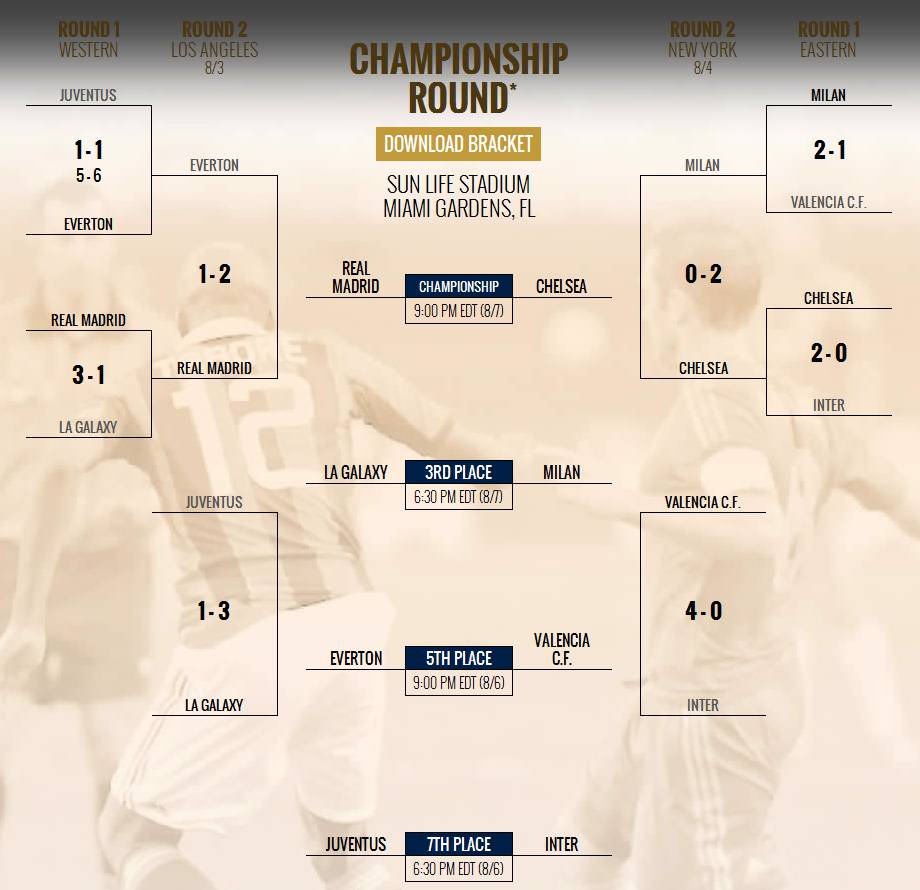 GUINNESS CUP TABELLONE – Con la sfida fra il Milan e il Chelsea giocatasi questa notte alle ore 00.00, si è concluso il secondo turno della Guinness Cup, prestigioso torneo estivo iniziato in Europa e che si sta concludendo negli Stati Uniti. Il Milan, dopo aver battuto il Valencia e aver perso contro il Chelsea, affronterà ora i Los Angeles Galaxy campioni della MLS, per la finalina terzo/quarto posto. La sfida si giocherà mercoledì prossimo così come la finalissima, la supersfida fra il Chelsea e il Real Madrid. Di seguito il tabellone completo della Coppa.