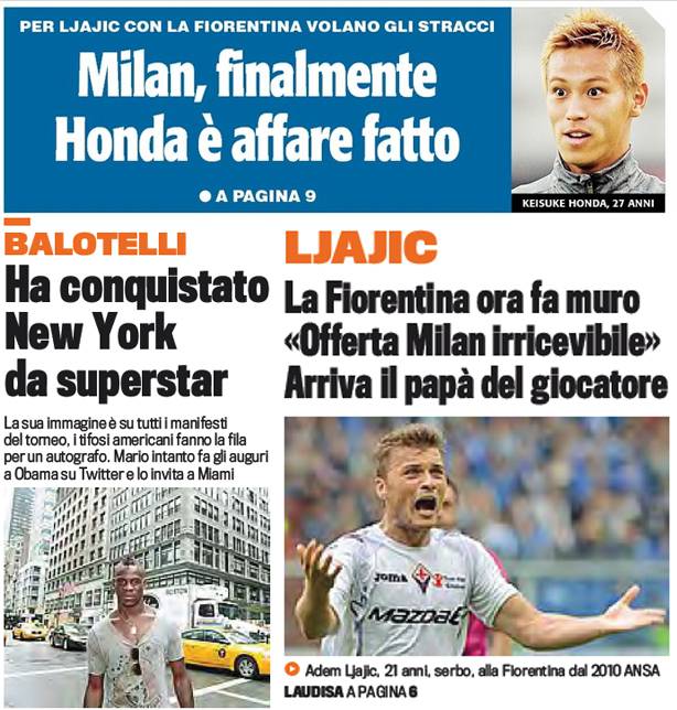 I titoli Gazzetta, CorSport e Tuttosport: Honda affare fatto! Caos Ljajic, Balo conquista New York – Foto 05/08/2013 - 07:13 di Redazione2 RASSEGNA STAMPA MILAN FOTO – Di seguito potete trovare i principali titoli dei tre quotidiani sportivi, La Gazzetta dello Sport, Corriere dello Sport e Tuttosport, riguardanti naturalmente il nostro Milan. La redazione di Milanlive.it