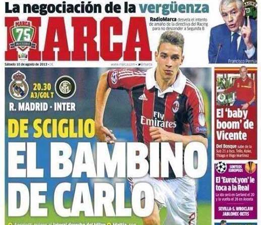CALCIOMERCATO MILAN – Clamorosa notizia di mercato riportata stamane dal quotidiano Marca. Stando a quanto raccolto dal giornale sportivo iberico molto vicino al Real, le Merengues si sarebbero messe sulle tracce di Mattia De Sciglio, giovane talento di casa Milan. Viste le difficoltà nell’arrivare a Gareth Bale Ancelotti avrebbe dato mandato ai suoi dirigenti di virare sul 20enne rossonero. Galliani ha sempre considerato incedibilissimo il giovane terzino, vedremo come reagirà di fronte ad una proposta concreta.
