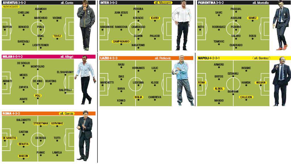 CONFRONTO BIG SERIE A – La difesa a quattro, i tre dietro a centrocampo e l’attacco a due punte. Sono questi i tre diktat di Massimiliano Allegri per le sue squadre. Il Milan, come evidenza una recente inchiesta de La Gazzetta dello Sport, è l’unica società d’Italia fra le big ad attuare la retroguardia a quattro e in contemporanea l’attacco a due. La Juve, infatti, usa il 3-5-2, così come Inter e Fiorentina. La Roma e la Lazio puntano sul 4-3-3, mentre il Napoli, è la più “moderna” del gruppo, con il 4-2-3-1 tanto di moda in questo periodo fra i top club del Vecchio Continente.