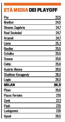 PLAYOFF CHAMPIONS – E’ un Milan giovane quello targato 2013-2014 ma in Europa c’è chi riesce a fare meglio. La Gazzetta dello Sport ha pubblicato stamane la classifica dell’età media dei rossoneri, rapportandola a quella delle altre squadre che giocheranno i playoff di Champions. Al primo posto troviamo il PSV, l’avversario proprio del Milan, con soli 22,5 anni di media. Quinto posto per l’Arsenal seguita dal Lione. Milan solo 14esimo con 26,5 anni di età media, anche se la tendenza rossonera è in netto cambiamento rispetto a quella di qualche stagione con fa, con il club di via Turati orientato verso la linea verde.