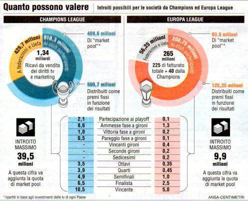 FOTO MILAN CHAMPIONS LEAGUE – Quanti introiti può ottenere una squadra qualificandosi e andando avanti nella Champions League? Tantissimi soldi. Fase per fase, ecco le cifre dei guadagni di ogni club. Come si vede dalla foto tratta da La Nazione, la massima cifra che un ipotetico team può raccimolare dalla CL è quella di 39,5 milioni di euro nel caso in cui arrivi a vincere la competizione. Prendendo la situazione del Milan, si capisce quanto sia importante accedere alla fase a gironi: balla tanto denaro fra premi, merchandising e introiti tv. Dopo di che sarà tutta una scalata fino alla finale. Decisamente inferiore il valore dell’Europa League: circa 10 milioni di euro.