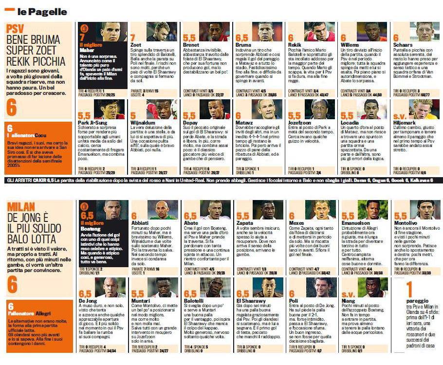 Secondo il noto quotidiano sportivo i migliori in campo tra i rossoneri sono stati Boateng, Abate, De Jong, Balotelli ed El Shaarawy.