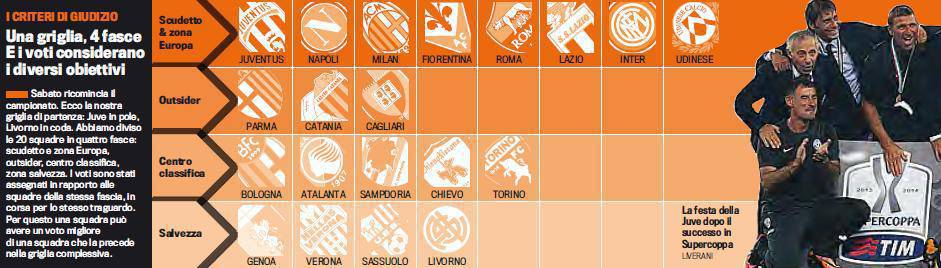 Juventus ovviamente in testa nella prima fascia, poi Napoli e Milan. A seguire Fiorentina, Roma, Lazio ed Inter.