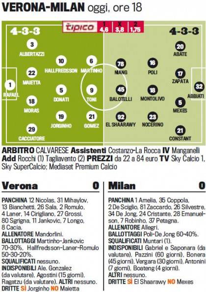 VERONA MILAN – La Gazzetta dello Sport propone la propria grafica relativamente alle formazioni di Verona e Milan che questo pomeriggio alle ore 18 scenderanno in campo per la prima partita di campionato.