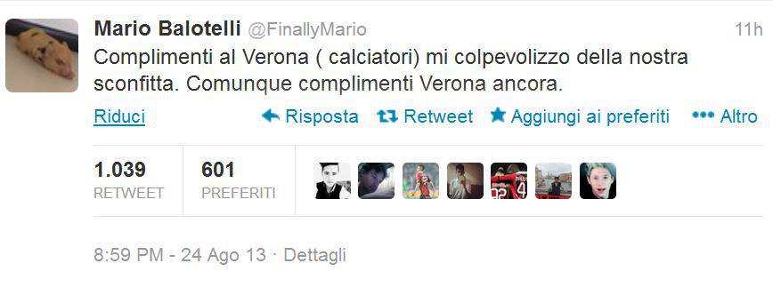 MILAN BALOTELLI – Mario Balotelli, attaccante del Milan, sul proprio profilo Twitter ha postato il seguente messaggio: “Complimenti al Verona (calciatori) mi colpevolizzo della nostra sconfitta. Comunque complimenti Verona ancora“.