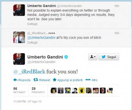 MILAN GANDINI INSULTI – Insulti per il direttore organizzativo del Milan, Umberto Gandini, più comunemente noto come “ministro degli esteri” rossoneri. Dopo essere stato insultato su Twitter il dirigente del Diavolo ha deciso di rispondere a modo, mandando a quel paese il tifoso in questione. Di seguito la foto dell’accaduto.