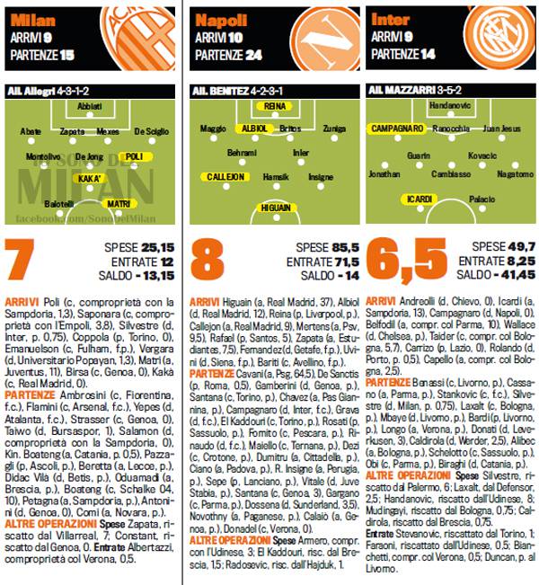 CALCIOMERCATO MILAN – Promuove il mercato del Milan La Gazzetta dello Sport. Il quotidiano meneghino, in edicola stamane, ha assegnato un 7 pieno alle trattative estive rossonere, conclusesi in particolare con l’arrivo di Poli, Saponara, Matri e la ciliegina sulla torta Kakà. La Rosa considera comunque la Juventus e il Napoli le regine assolute della finestra estiva con un voto 8, per via degli sbarchi di Higuain, Tevez, Ogbonna, Albiol e via dicendo: siete d’accordo con questi voti?