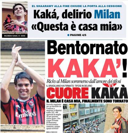 I titoli Gazzetta, CorSport e Tuttosport: cuore Kakà, bentornato, delirio Milan “Questa è casa mia” – Foto 23/09/2013 - 11:0103/09/2013 - 07:01 di Redazione2 RASSEGNA STAMPA MILAN FOTO – Di seguito potete trovare i principali titoli dei tre quotidiani sportivi, La Gazzetta dello Sport, Corriere dello Sport e Tuttosport, riguardanti naturalmente il nostro Milan. La redazione di Milanlive.it