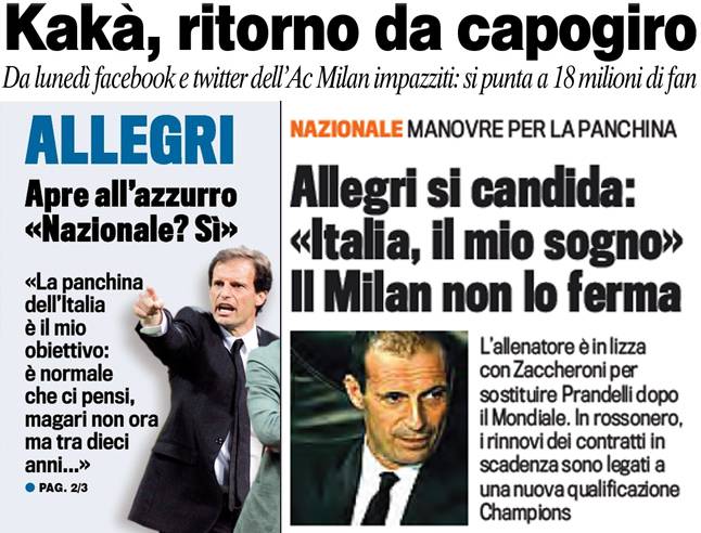 Home » rassegna stampa milan » I titoli Gazzetta, CorSport e Tuttosport: Kakà, ritorno da capogiro, Allegri in Nazionale e il Milan non lo ferma – Foto