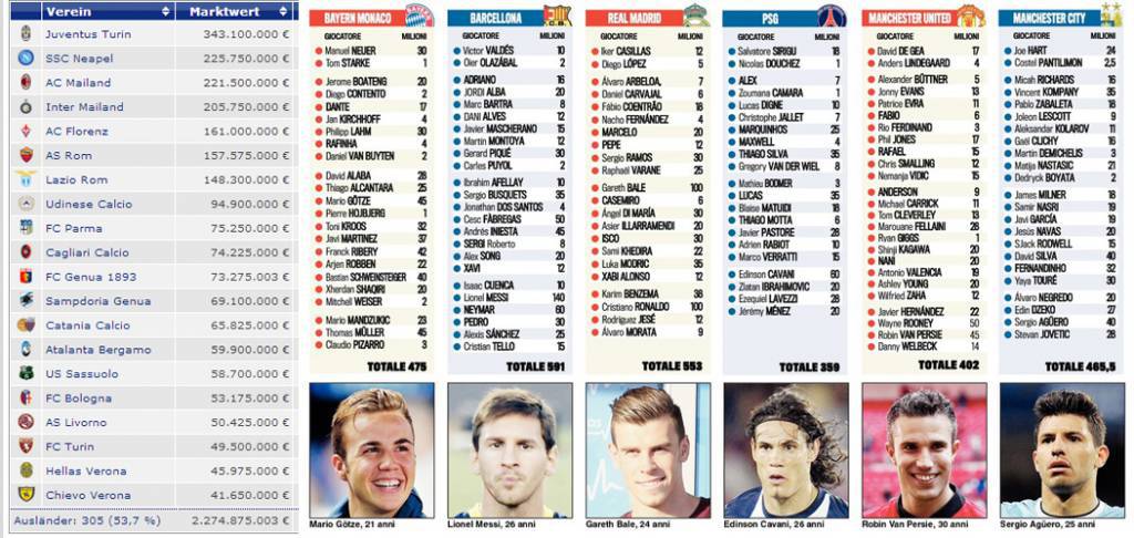 CALCIOMERCATO – Quanto valgono le grandi società calcistiche d’Europa? Una domanda a cui ha cercato di dare una risposta stamane il quotidiano Tuttosport. E’ stato quindi stilato un elenco delle big del Vecchio Continente, in particolare, di Real, Barcellona, PSG, City, Bayern e United. A loro abbiamo rapportato i valori delle squadre italiane, utilizzando il noto sito Transfermarkt.it. Si scopre quindi che la squadra più quotata d’Italia è la Juve con 343 milioni di euro mentre il Milan ne vale 221, quasi un terzo del Real Madrid. Siete d’accordo con queste quotazioni?