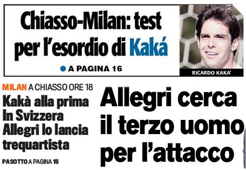 I titoli Gazzetta, CorSport e Tuttosport: Kakà in campo contro il Chiasso, Allegri cerca il terzo uomo – Foto 23/09/2013 - 10:5707/09/2013 - 07:13 di Redazione2 RASSEGNA STAMPA MILAN FOTO – Di seguito potete trovare i principali titoli dei tre quotidiani sportivi, La Gazzetta dello Sport, Corriere dello Sport e Tuttosport, riguardanti naturalmente il nostro Milan. La redazione di Milanlive.it