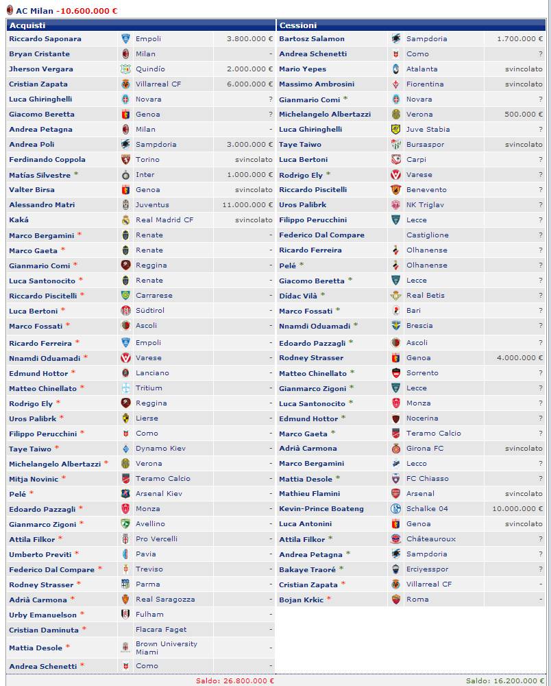 CALCIOMERCATO MILAN – Conclusosi definitivamente il mercato estivo 2013 è possibile tirare le prime somme, almeno a livello di statistiche. Aiutandoci con il sempre preciso Transferkmarkt.it si evince come il Milan si sia assicurato 8 nuovi giocatori (escluse le promozioni dalla Primavera ed eventuali rientri da prestiti). Il più pagato è Matri, circa 11 milioni di euro, seguito da Saponara (3,8), senza tenere conto dei 6 milioni versati dal Milan al Villarreal per riscattare definitivamente Zapata. In totale sono stati spesi 26,8 milioni di euro ed incassati 16,2.