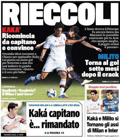 I titoli Gazzetta, CorSport e Tuttosport: Kakà ricomincia da capitano e convince, 8000 tifosi a Chiasso – Foto 23/09/2013 - 10:5708/09/2013 - 07:21 di Redazione2 RASSEGNA STAMPA MILAN FOTO – Di seguito potete trovare i principali titoli dei tre quotidiani sportivi, La Gazzetta dello Sport, Corriere dello Sport e Tuttosport, riguardanti naturalmente il nostro Milan. La redazione di Milanlive.it