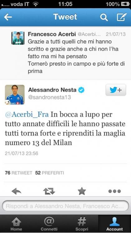 NESTA ACERBI TWITTER – Bello scambio di battute su Twitter fra Nesta e Acerbi. Il difensore dei Montreal Impact aveva augurato, lo scorso 21 luglio, una pronta guarigione al centrale del Sassuolo dopo il tumore, augurandogli inoltre di riprendersi la maglia numero 13 del Milan. Acerbi ha replicato nelle scorse ore a Nesta, scrivendogli: “Grazie di cuore per gli auguri tu sei il mio idolo. Sto lavorando duramente per tornare quello di 2 anni fa”.