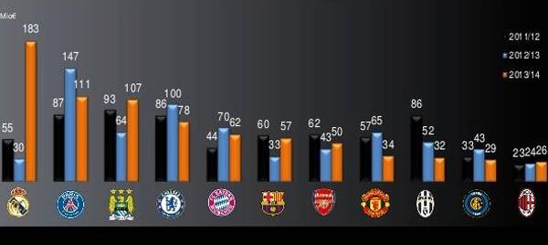 CALCIOMERCATO MILAN – Una splendida grafica pubblicata nelle ultime ore sul web ha evidenziato gli investimenti delle principali società europee, italiane comprese, negli ultimi tre anni. Il Milan, da quanto si evince, ha investito 73 milioni di euro, circa 25 di media a stagione. Un dato quasi imbarazzante se rapportato a quanto speso ad esempio dalle Merengues dal 2010 ad oggi, ben 268 milioni di euro, quasi 4 volte di più rispetto ai rossoneri. 170 i milioni di euro spesi dalla Juve, la società che ha investito di più insieme al Napoli fra le big tricolore. Impressionanti anche le spese di PSG e City.