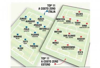 CALCIOMERCATO TOP 11 SVINCOLATI – Sono moltissimi i calciatori di livello che a partire dal prossimo mese di febbraio saranno liberi di firmare con qualsiasi società, per via del loro contratto in scadenza al 30 giugno del 2014. La redazione di Tuttosport ha stilato due top 11: una dei migliori svincolati italiani, ed una di top all’estero. Spiccano giocatori da Milan come Lewandowski del Borussia Dortmund, Xabi Alonso e Menez, Rosicky, Terry, Vidic ed Evra. In Italia c’è il nostro Robinho, che è stato erroneamente inserito nella formazione nonostante abbia rinnovato il suo contratto con il Milan. Ci sono anche Totti, Pirlo, Zuniga e molti altri ancora: chi vorreste per il Milan?
